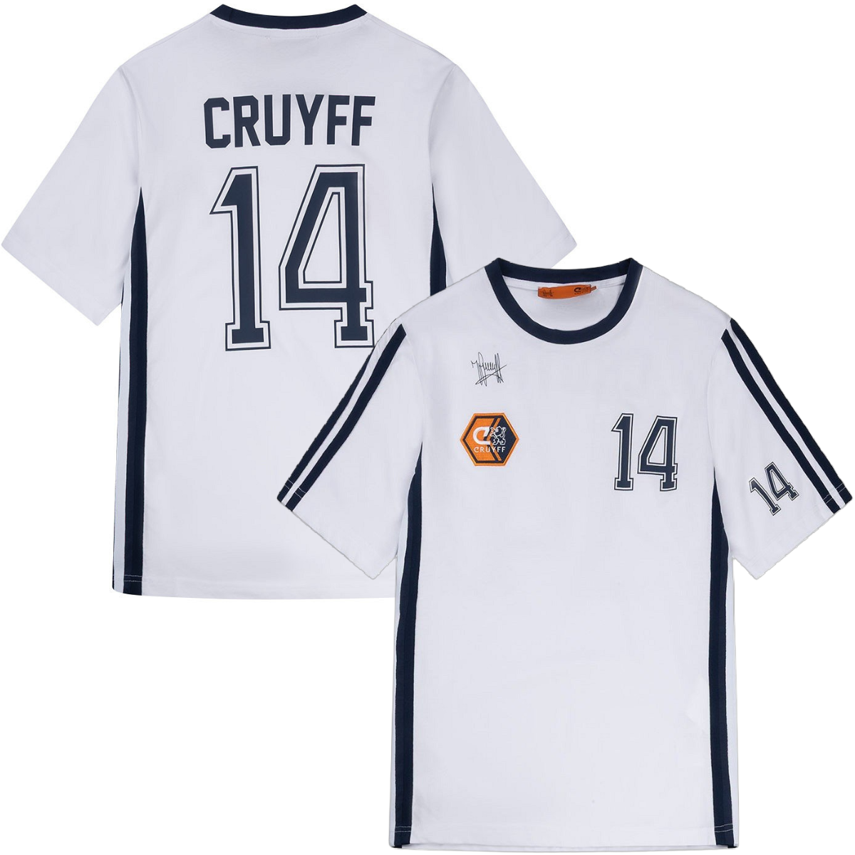 Le design associe une base blanche à des accents bleu marine puissants. Le col rond et les bandes caractéristiques sur les manches ainsi que le long des côtés sont réalisés en bleu marine, créant un look rétro authentique et sportif. Sur la poitrine droite figure la signature de Johan Cruyff, accompagnée d’un badge Cruyff spécial. La poitrine gauche affiche le numéro 14 emblématique.