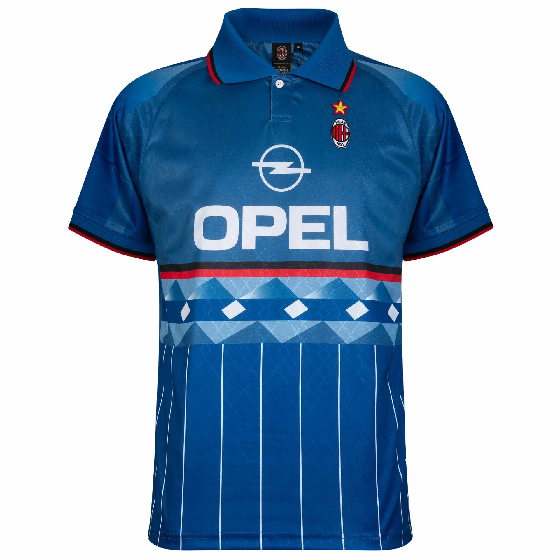 Il s'agit du 4ème maillot de football rétro officiel de l'AC Milan 1995-1996. Ce maillot de football rétro de Milan est basé sur le quatrième maillot de football de l'AC Milan de la saison 1995/96. Le maillot de football rétro est principalement de couleur bleue. Au milieu se trouve le nom du sponsor OPEL de l'époque. La poitrine gauche contient le logo de l'AC Milan avec une étoile dorée au-dessus. Le bas du maillot de football rétro présente de fines rayures blanches. De plus, ce maillot de football rétro de l'AC Milan a un col boutonné et un col polo bleu avec une ligne rouge et noire. Le passepoil contient également ces couleurs. Joli maillot de football de l'AC Milan pour le vrai fan de Milan ! Le maillot de football rétro de l'AC Milan de Score Draw a une coupe normale. Matériau : 100 % polyester recyclé.