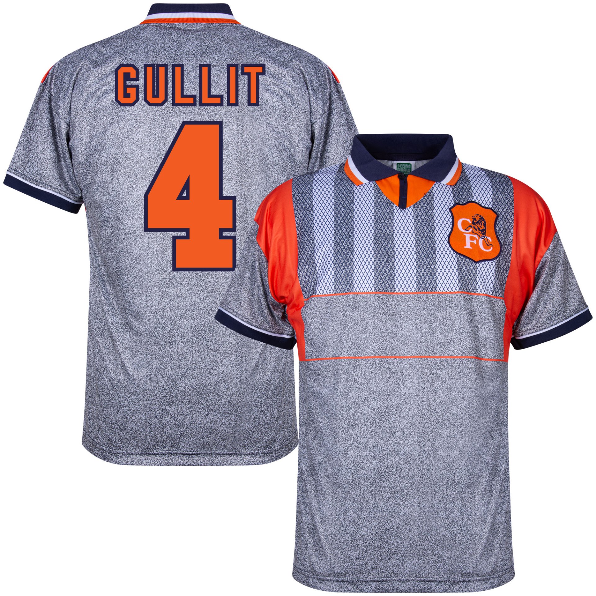 Le maillot rétro Chelsea est principalement gris et comporte des détails orange et bleu foncé remarquables. Les deux épaules présentent des panneaux orange et la poitrine est décorée d’un motif distinctif de losanges et de rayures, qui donne au maillot son style rétro unique. Le col polo bleu foncé avec un liseré blanc et orange apporte une finition classique. L’écusson du club Chelsea est présent sur la poitrine côté gauche.
