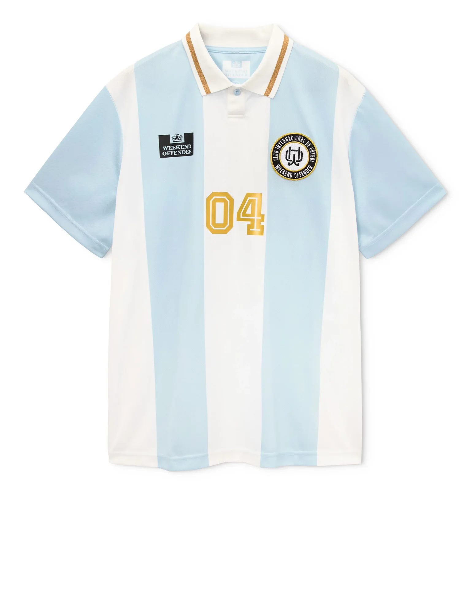 Le maillot de football Moulay de Weekend Offender est un mélange élégant d’influences rétro et de streetwear moderne. Inspiré des tenues sud-américaines classiques, ce maillot se distingue par ses larges rayures verticales bleu clair et blanc, un clin d’œil au maillot emblématique de l’équipe nationale d’Argentina national football team.